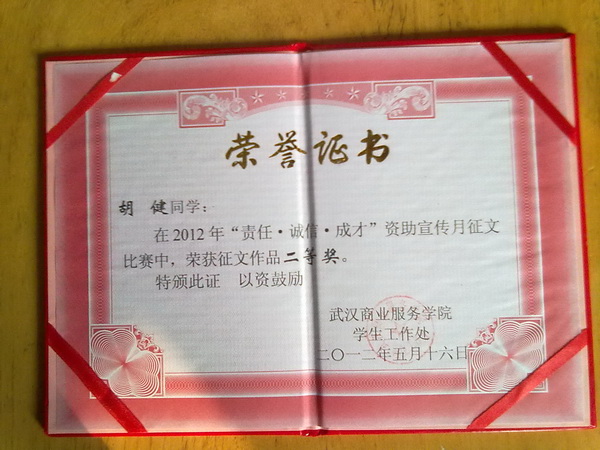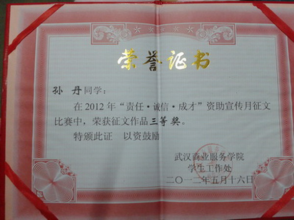 2010年,我如愿收到了大学的通知书,我的家庭也因此赢来了幸福和温馨。而苦脑也由然而来那将近5位数的学费,给予我这个贫困的家庭巨大的压力,如果我选择外出打工,那么我就可以为我的家庭减少了负担,减少了一大笔的经济开支。可我不甘心,不甘心自己梦想己久的大学就这样跟自己擦肩而过。而我的家人懂我的心思,他们坚决让我上大学,他们到亲戚家和朋友家里去借,再加上没日没夜工作所得的辛苦钱,终于筹够了我的学费,让我如愿踏上了武汉商业服务学院的大门,那一刻在心底萌发的感动是无法用言语表达出来的。