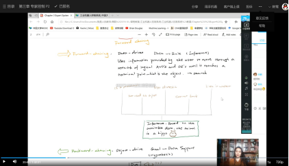 陈莺老师在腾讯课堂用英语和汉语两种语言带来了《工业机器人控制系统》课程的双语课。针对专家系统这一抽象的推理模型,陈老师自编讲义,采用启发式的教学模式,通过案例导入,深入浅出地给学生讲解知识点,分析重难点。学生普遍反映,陈老师英语口语流利,案例贴近生活,上陈老师的线上课是一场视觉与听觉的双重盛宴。