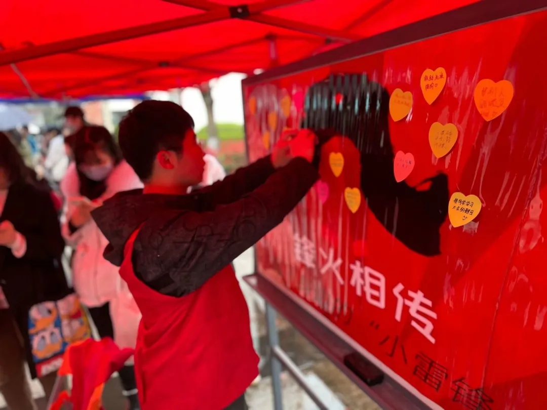 同学们将写完的“心形便签”贴在“‘锋火相传”的雷锋精神展板上,呈现出新时代新青年对雷锋精神的亲切思考。19级物业管理班的蔡可写到:“我曾组织同学一起去养老院给老人表演节目,也曾在英语学习中受到同学的热心辅导,这些都将成为我青春中永恒的温暖。”