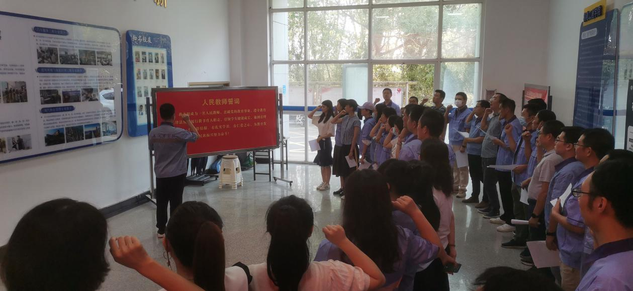 活动最后,学校2021年度师德先进个人郑拓老师领誓,全体教师面对《人民教师誓词》进行了庄严宣誓。通过教师宣誓,进一步弘扬高尚师德,展现教师的职业理想、职业操守和职业精神,使全体教师充分认识到了人民教师的光荣使命,促使教师恪尽职守,履职尽责。