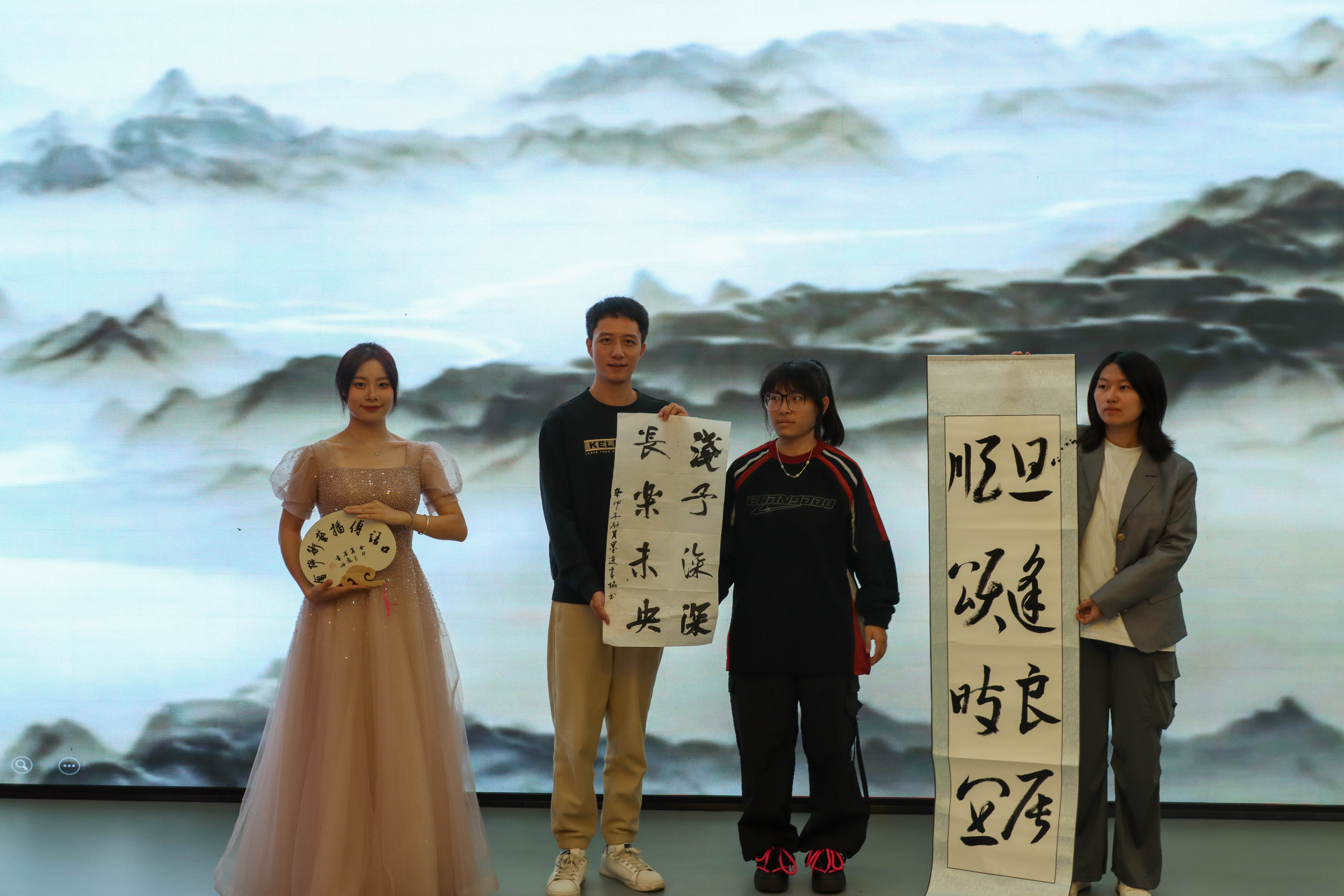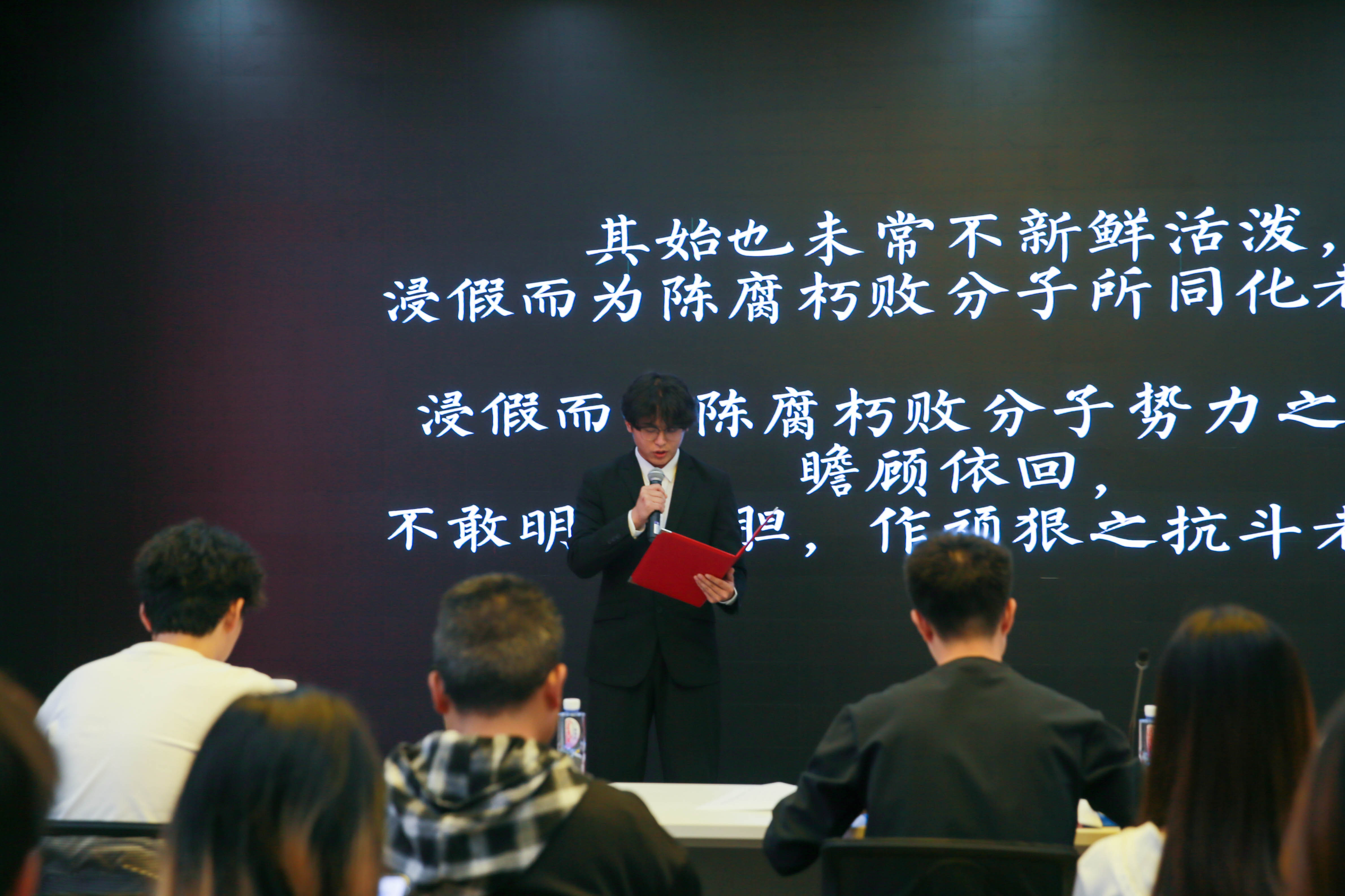 “万人都要将火熄灭,我一人独将此火高高举起。”活动伊始,楚天玥同学以一首《祖国,或以梦为马》拉开本次活动的帷幕,铿锵有力、富有激情的朗诵成功点燃现场的气氛。随后,伴随雄壮的乐曲,赵开心同学一字一句地朗声诵读起《少年中国说》,用声音激起在场听众的一腔热血。“少年强则国强,少年独立则国独立。”在一段段富有感情的朗诵中,大家重温了革命先烈们的爱国情怀,感受到了锐意进取的磅礴力量。接着,邓欣哲为大家带来了一首原创诗《成人》,并在诗中声情并茂地讲述了自己的成长历程;在付恒朗诵完饱含深情的《敬告青年》后,胡林娜与肖嘉琦用中英双语为大家带来创意十足的朗诵,让红色经典在两种话语的碰撞下更加熠熠生辉。朗诵结束后,墨逸书协负责人覃茹琦泼墨挥毫,为口语传播艺术协会赠字。在表彰环节,负责人为协会优秀成员颁发“璀璨之星”“思博之星”优秀读书分享人等各奖项,共52名协会成员获奖。