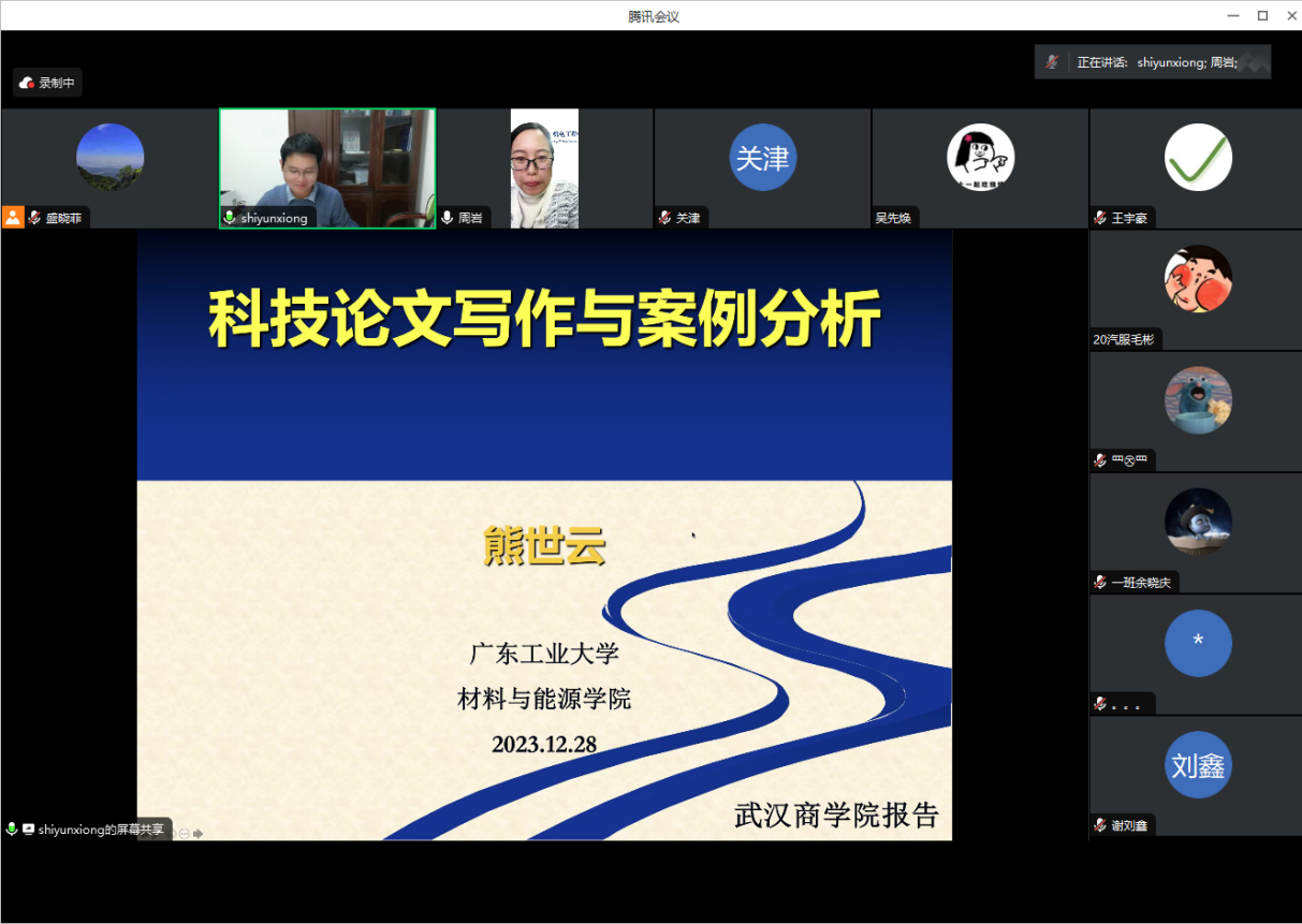 2023年12月28日晚上威廉希尔williamhill官网举办了《科技论文写作及案例分析》的学术讲座。此次活动特别邀请到广东工业大学教授,博士生士生导师,德国洪堡学者,熊世云教授作为主讲人。威廉希尔williamhill官网专任教师参加了此次讲座,讲座采用腾讯