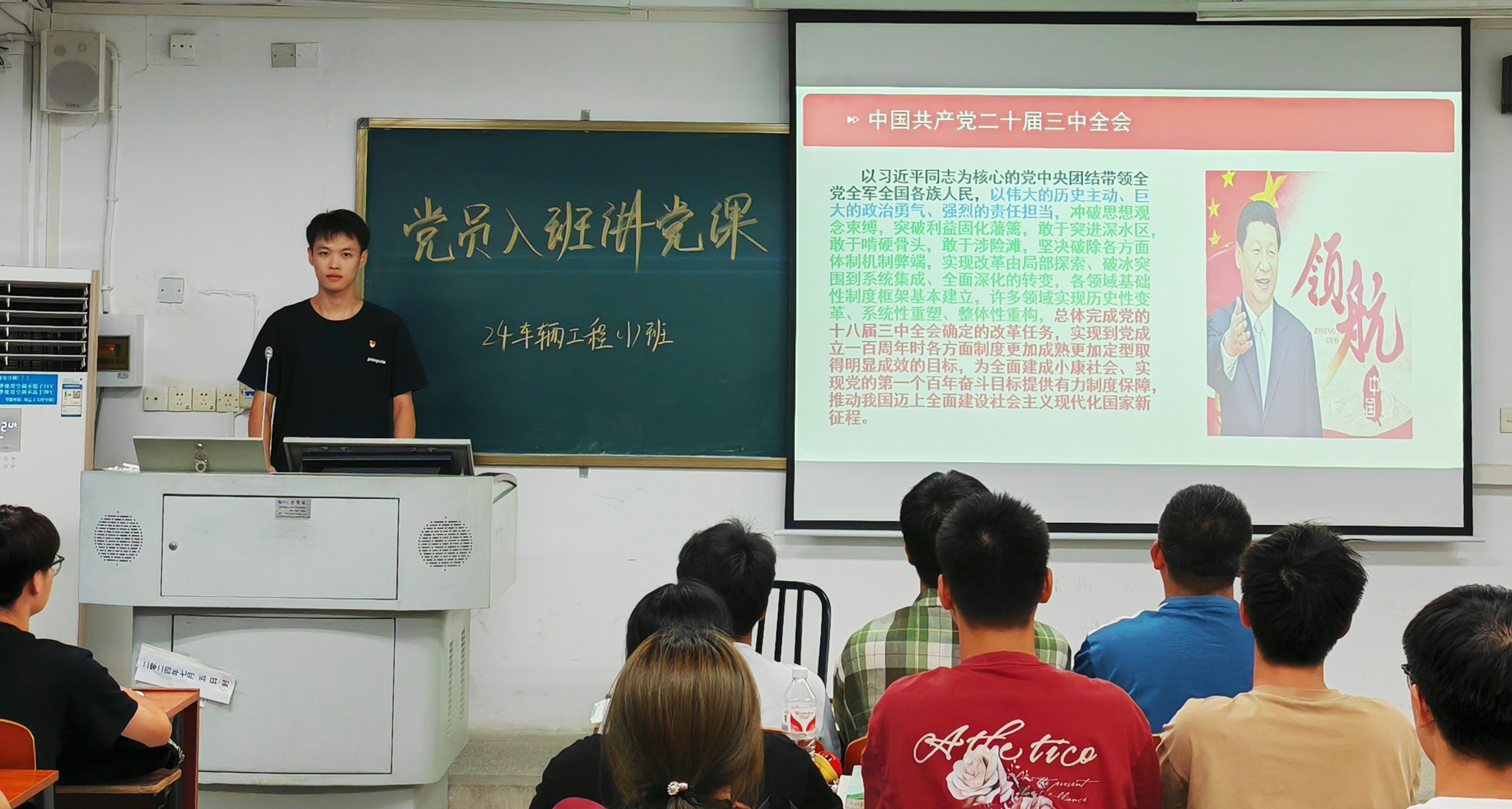 课堂上,学生党员们以“学习贯彻党的二十届三中全会精神”为主题,通过PPT展示讲解,帮助同学们更加深入地了解党的基本理论、基本路线、基本方针和政策,同时,学生党员们紧紧围绕党的二十届三中全会的核心议题进行深入浅出地讲解。他们不仅深入剖析了全面深化改革的重大意义,还详细解读了《中共中央关于进一步全面深化改革、推进中国式现代化的决定》中的关键内容,特别是关于经济、政治、文化、社会、生态文明、国家安全等多方面的改革部署。通过鲜活的案例和生动的比喻,让新生们深刻感受到了改革对于国家发展和民族复兴的关键作用。课堂的最后,学生党员们鼓励新生们好好学习专业知识,不断努力奋斗,用青春力量书写改革新答卷,让青春在推进中国式现代化伟大进程中绽放光彩。