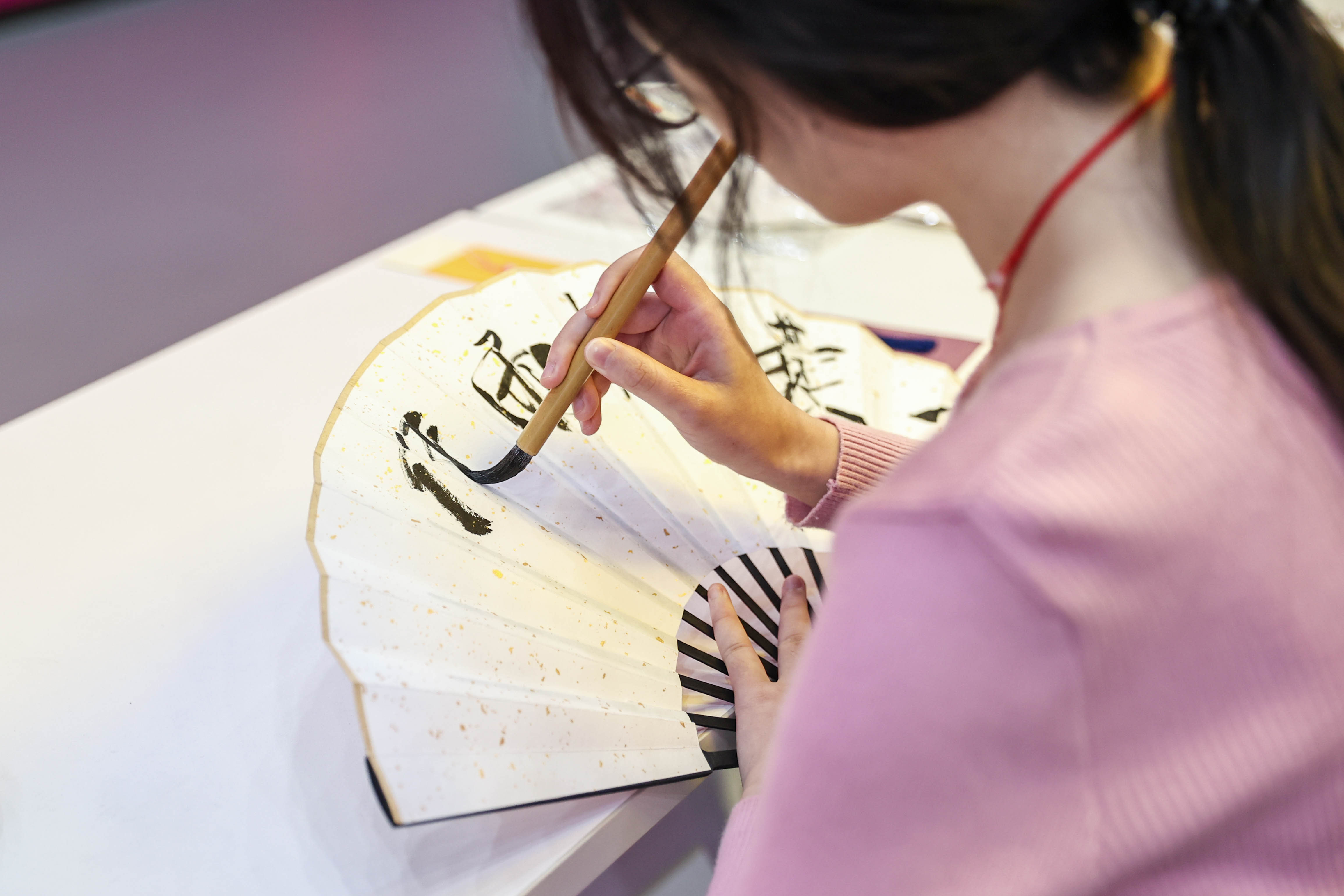 而在书法展示区,同样是精彩纷呈。书法爱好者们齐聚一堂,以笔墨为媒介,抒发着浓厚的家国情怀。他们挥毫泼墨,笔走龙蛇,在宣纸上行云流水般地书写着对祖国、对人民深深的热爱。“政通人和”、“家国永安”,一幅幅书法作品,或气势磅礴,或刚劲有力,或飘逸洒脱,展现出了书法艺术的独特魅力。那浓淡相宜的墨香,仿佛是一种无声的语言,与朗诵的声音相互呼应。书法作品中的每一个字都像是一颗璀璨的明珠,它们组合在一起,形成了一部部用线条和墨韵书写的家国史诗。从毛泽东等伟人的诗词到体现中华民族精神的名言,这些内容在书法家们的笔下焕发出新的生机,传递出一种跨越时空的力量,让人们在欣赏书法之美的同时,更深刻地领悟到家国情怀的内涵。对次,参加活动的学生胡劲表示:“我对书法的热忱能在此活动中完美展现,我很开心因为活动丰富了我的校园生活。”