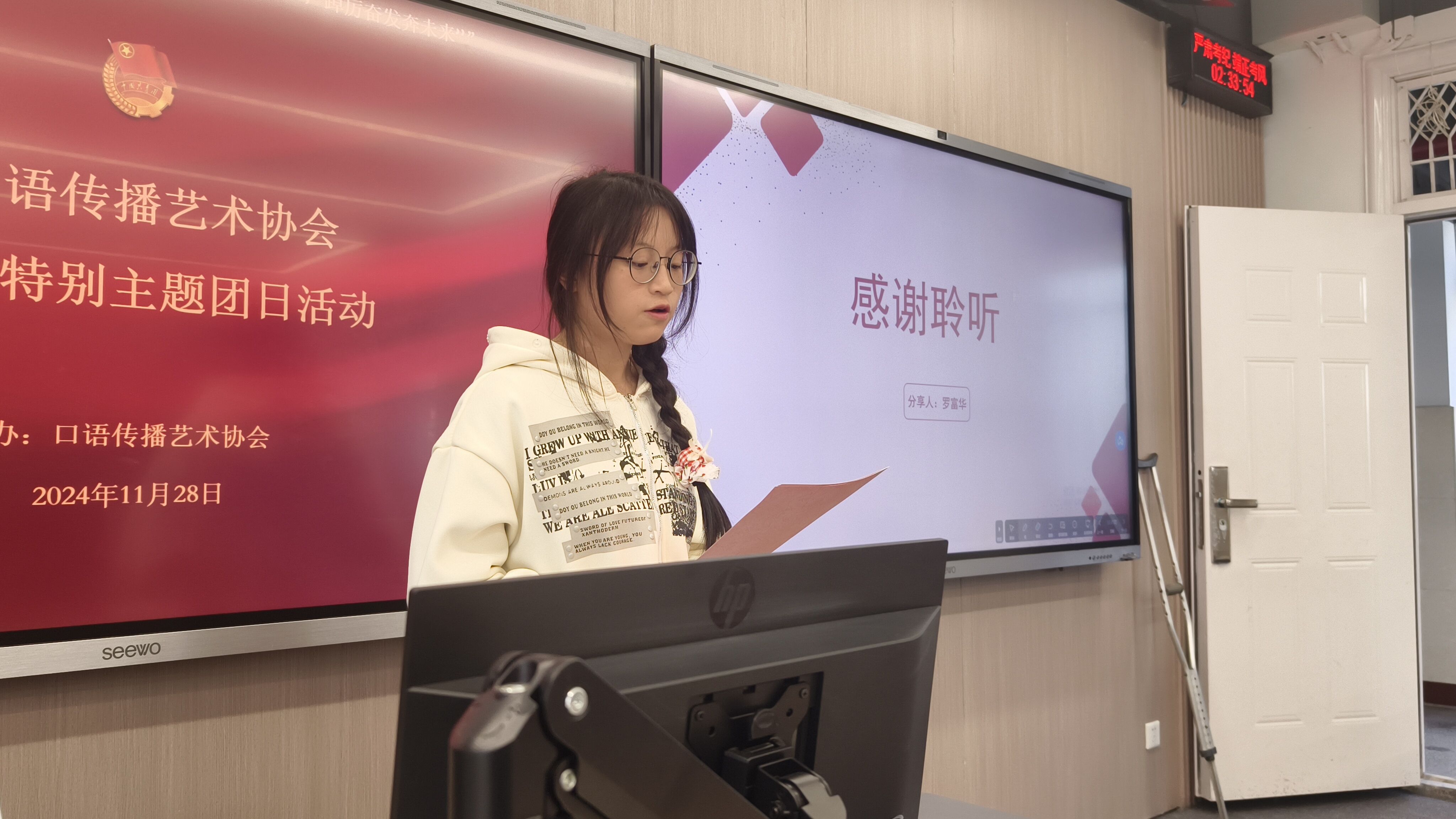 11月28日,口语传播艺术协会十一月特别主题团日活动暨第十九期“青春致远”读书分享会“经典领读”系列之“光阴荏苒辞旧岁,踔厉奋发奔未来”活动在南一207教室圆满举行。本次活动由口语传播艺术协会主办,通过阅读与交流,提升青年的文化素养和时代使命,吸引了全校40位同学参与本次读书分享会。